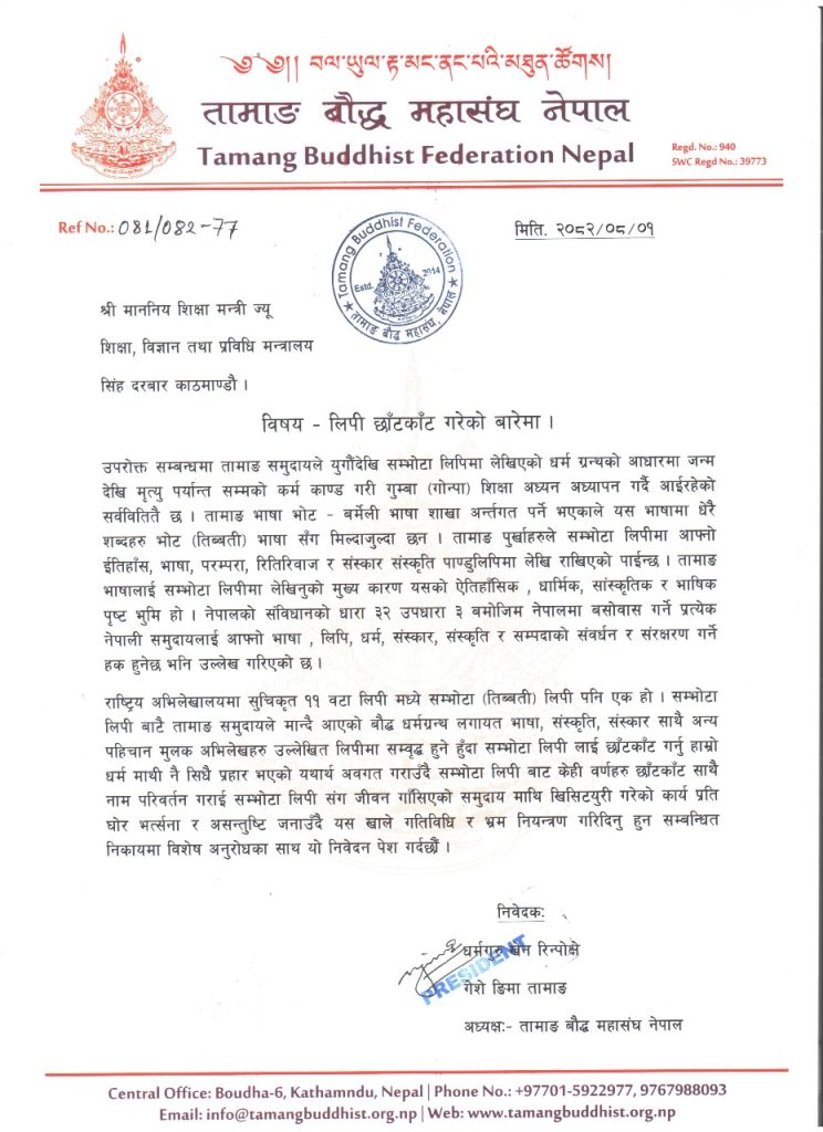महासंघले ज्ञापनपत्रमार्फत तामाङ समुदायले जन्मदेखि मृत्युपर्यन्तका सबै बौद्ध कर्मकाण्ड, धार्मिक शिक्षा, गुम्बामा अध्ययन अभ्यासमा निरन्तर प्रयोग गर्दै आएको सम्भोटा (तिब्बती) लिपिलाई मनपरी ढंगले छाँटकाँट, संशोधन वा रूपान्तरण गर्न थालिएको गतिविधिप्रति गम्भीर असन्तोष व्यक्त गरेको थियो।